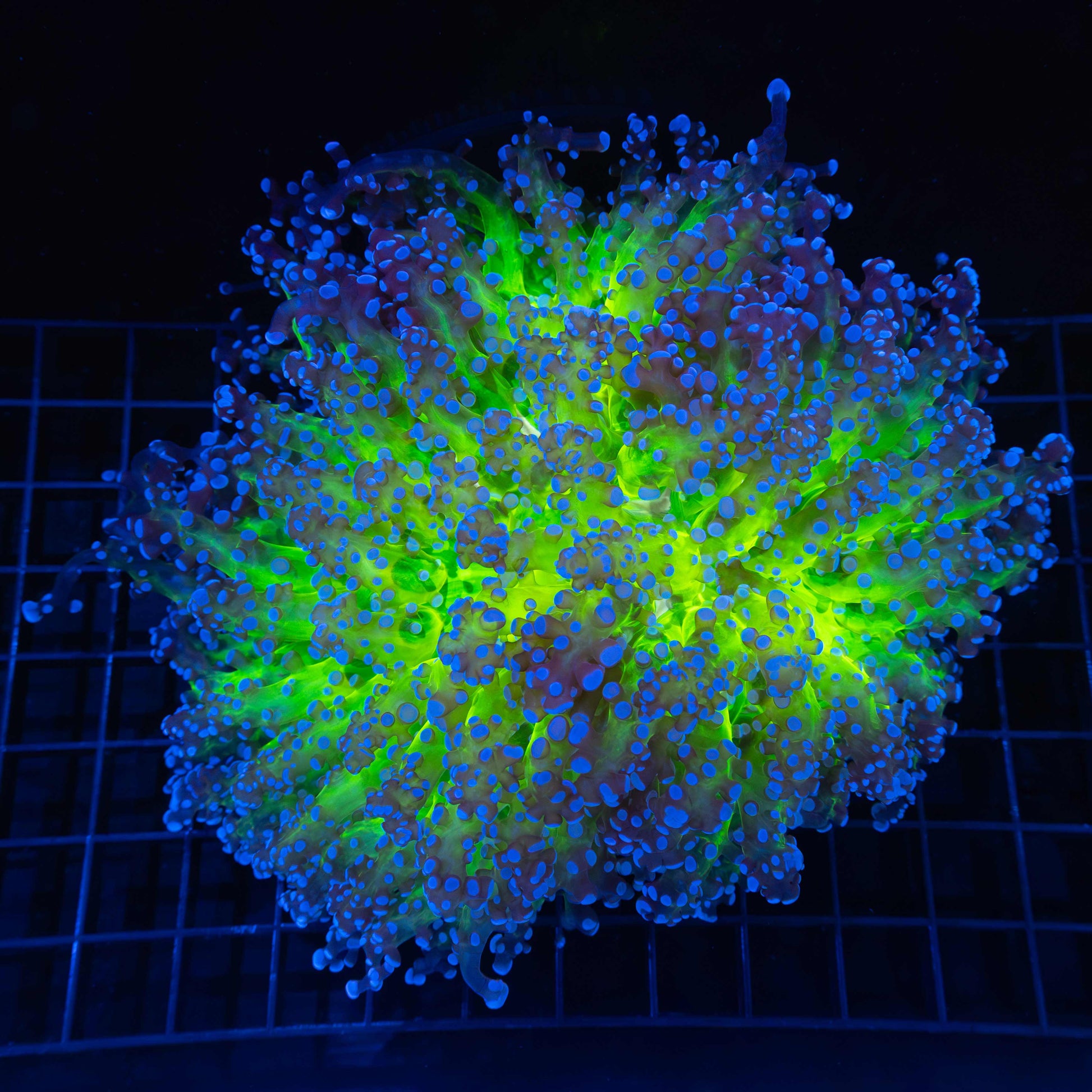 XL Glowing Core Branch Octospawn 7.5" WYSIWYG Approximately 7.5" Super bright yellowish green middle and blue tips. Heads get large before branching (up to 8"). Bright blue, neon green and gold.